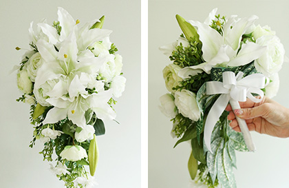 従来のワイヤリングブーケではできなかった『ナチュラルで流れや動きのある、茎を見せられるブーケ』を実現しました。生花をブーケホルダーでアレンジするように作ることができ、それでいてワイヤリングブーケの強さを兼ね備えたブーケをご提案しています。