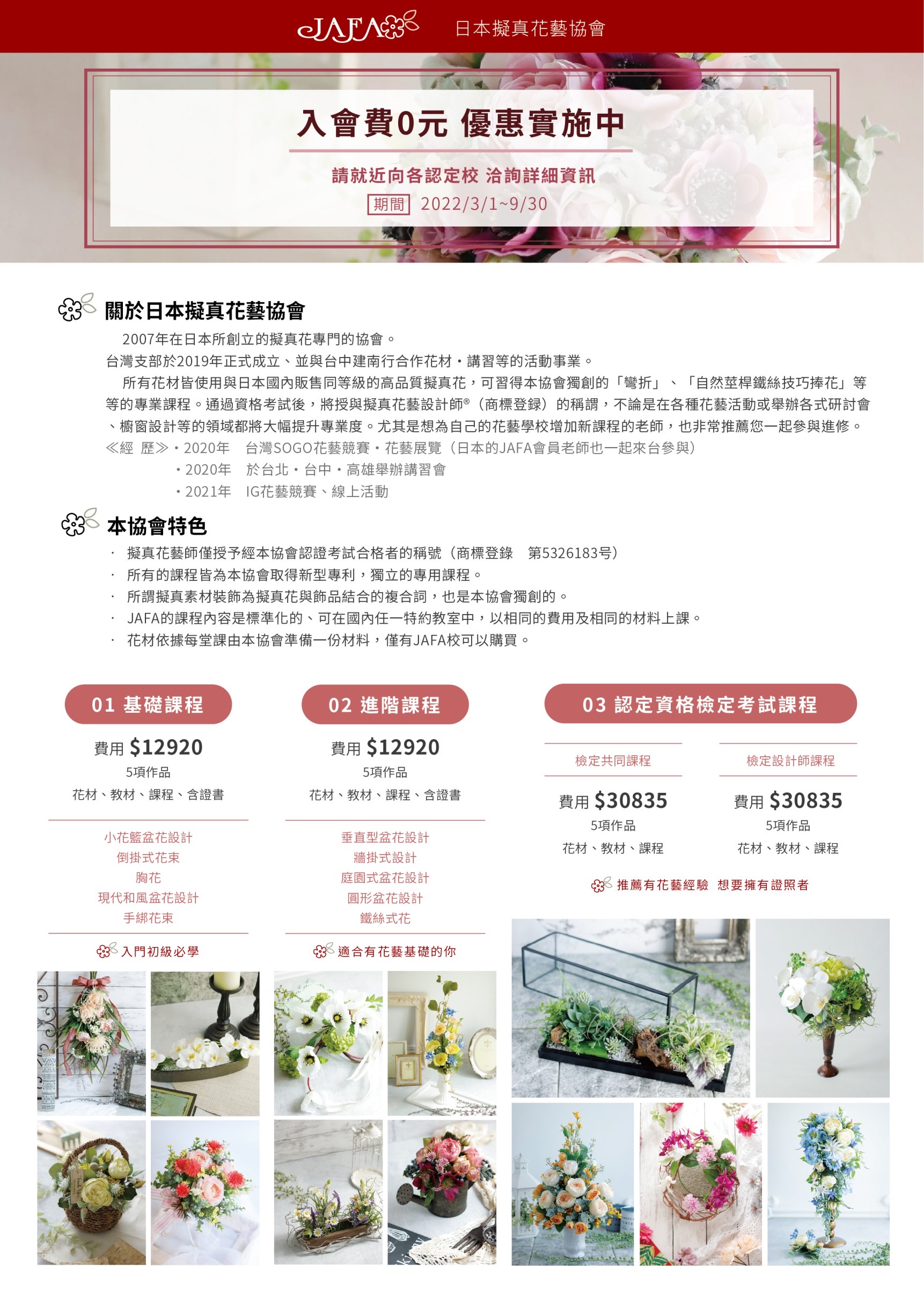 日本JAFA與日本兩大資材公司共同合作,使用日本的花材為教學資材,並且設計了獨家且專業的學習教程。